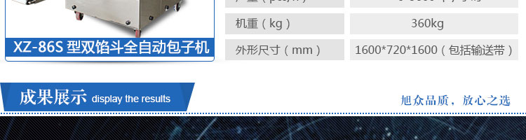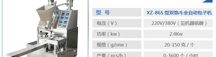XZ-86S型雙餡斗全自動(dòng)包子機(jī),可生產(chǎn)各種肉包、肉菜包、菜包、小籠包、湯包、水晶包、圓饅頭、奶黃包、豆沙包、叉燒包、南瓜餅等幾十種包餡制品。適用于賓館、飯店、學(xué)校、機(jī)關(guān)企業(yè)食堂、饅頭或包子加工廠、早餐工程店及速凍食品廠等單位。可滿足不同客戶群體。免費(fèi)提供工藝技術(shù)。免費(fèi)上門培訓(xùn)指導(dǎo)安裝。