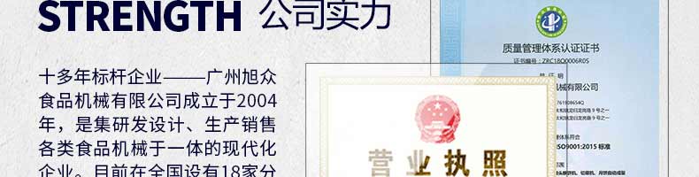廣州旭眾食品機(jī)械有限公司是一家集科研開發(fā),生產(chǎn)設(shè)計(jì),營銷服務(wù)為一體的現(xiàn)代化生產(chǎn)企業(yè)。現(xiàn)代化生產(chǎn)車間,精湛制造技術(shù),所產(chǎn)機(jī)械歷經(jīng)市場重重考驗(yàn),不斷贏得海內(nèi)外客戶的贊譽(yù)。