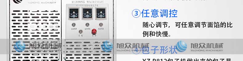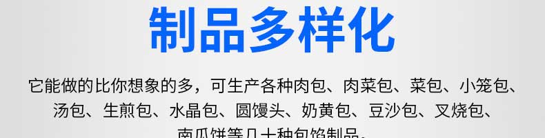 XZ-B812型多功能包子機,它能做的比你想象的多,可生產各種肉包、肉菜包、菜包、小籠包、湯包、生煎包、水晶包、圓饅頭、奶黃包、豆沙包、叉燒包南瓜餅等幾十種包餡制品。