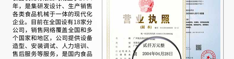 廣州旭眾食品機械有限公司是一家集科研開發,生產設計,營銷服務為一體的現代化生產企業?,F代化生產車間,精湛制造技術,所產機械歷經市場重重考驗,不斷贏得海內外客戶的贊譽。