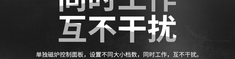 四頭柜式電磁爐,10檔調節,滿足各種烹飪。3500W火力十足,輕松選擇合適火力。同時工作互不干擾單獨磁爐控制面板,設置不同大小檔數,同時工作,互不干擾。