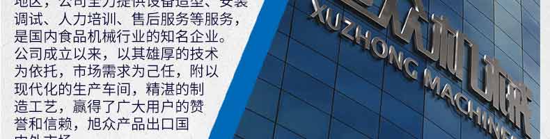 廣州旭眾食品機械有限公司是一家集科研開發,生產設計,營銷服務為一體的現代化生產企業。現代化生產車間,精湛制造技術,所產機械歷經市場重重考驗,不斷贏得海內外客戶的贊譽。