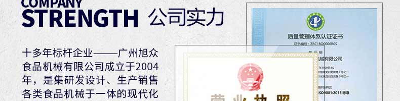 廣州旭眾食品機(jī)械有限公司是一家集科研開發(fā),生產(chǎn)設(shè)計,營銷服務(wù)為一體的現(xiàn)代化生產(chǎn)企業(yè)。現(xiàn)代化生產(chǎn)車間,精湛制造技術(shù),所產(chǎn)機(jī)械歷經(jīng)市場重重考驗(yàn),不斷贏得海內(nèi)外客戶的贊譽(yù)。