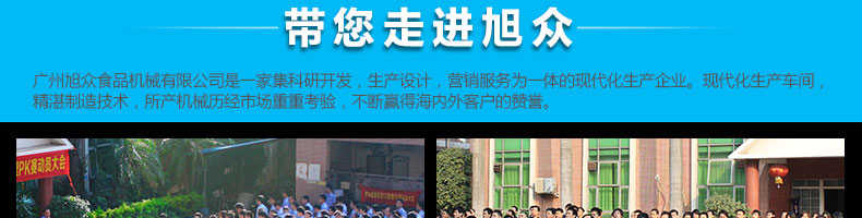 廣州旭眾食品機械有限公司是一家集科研開發(fā),生產(chǎn)設計,營銷服務為一體的現(xiàn)代化生產(chǎn)企業(yè)。現(xiàn)代化生產(chǎn)車間,精湛制造技術(shù),所產(chǎn)機械歷經(jīng)市場重重考驗,不斷贏得海內(nèi)外客戶的贊譽。
