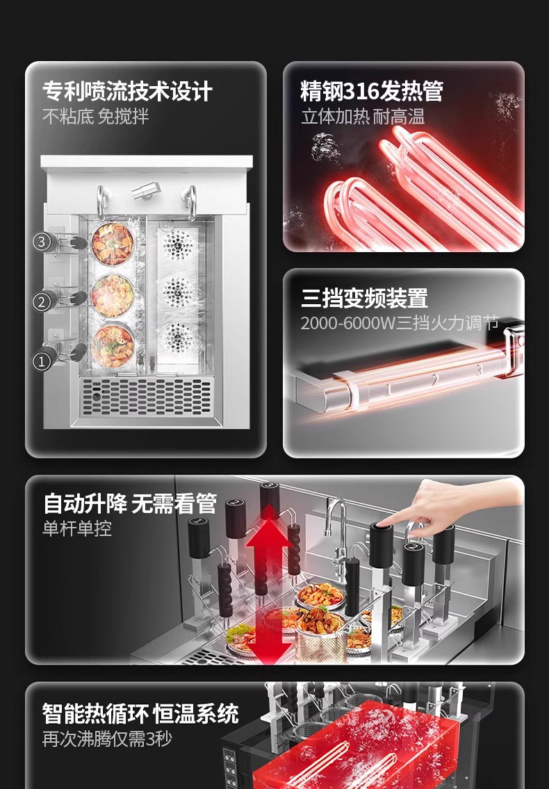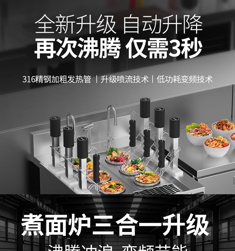 三合一煮面爐,全新升級,自動升降再次沸騰,僅需3秒。316精鋼加粗發熱管、升級噴流技術、低功耗變頻技術。煮面爐三合一升級,沸騰沖浪、變頻節能。