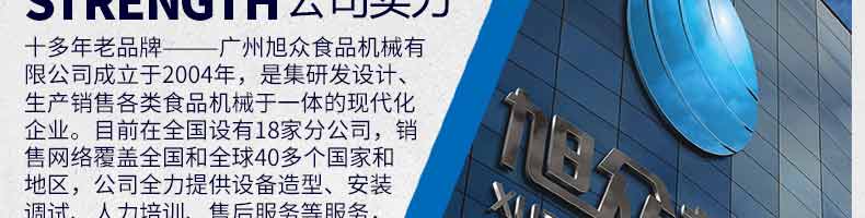 廣州旭眾食品機械有限公司是一家集科研開發,生產設計,營銷服務為一體的現代化生產企業。現代化生產車間,精湛制造技術,所產機械歷經市場重重考驗,不斷贏得海內外客戶的贊譽。
