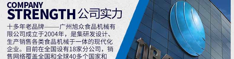 廣州旭眾食品機械有限公司是一家集科研開發,生產設計,營銷服務為一體的現代化生產企業?,F代化生產車間,精湛制造技術,所產機械歷經市場重重考驗,不斷贏得海內外客戶的贊譽。