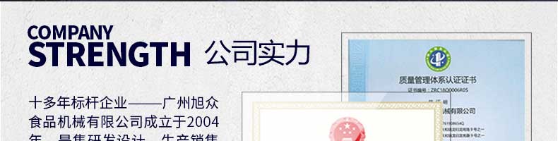 廣州旭眾食品機(jī)械有限公司是一家集科研開發(fā),生產(chǎn)設(shè)計(jì),營(yíng)銷服務(wù)為一體的現(xiàn)代化生產(chǎn)企業(yè)?,F(xiàn)代化生產(chǎn)車間,精湛制造技術(shù),所產(chǎn)機(jī)械歷經(jīng)市場(chǎng)重重考驗(yàn),不斷贏得海內(nèi)外客戶的贊譽(yù)。